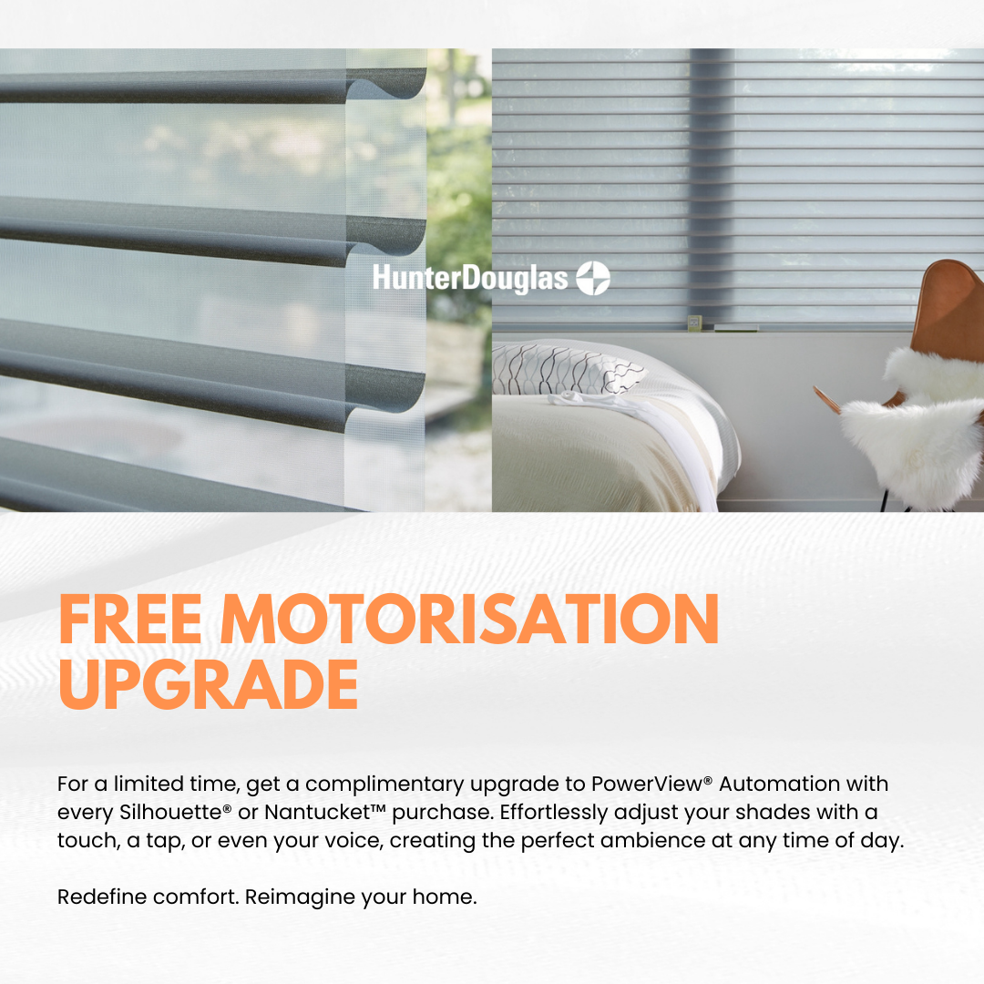 For a limited time, get a complimentary upgrade to PowerView® Automation with every Silhouette® or Nantucket™ purchase. Effortlessly adjust your shades with a touch, a tap, or even your voice, creating the perfect ambience at any time of day.